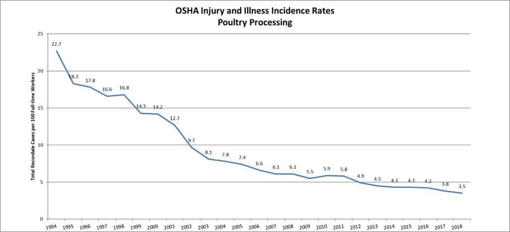 Poultry processing’s 2018 rate of 3.5 represents an 84 percent decrease from 1994 (the oldest data available on the BLS website), when the recorded rate was 22.7, demonstrating the vast advancements the industry has made in improving safety for its workforce.